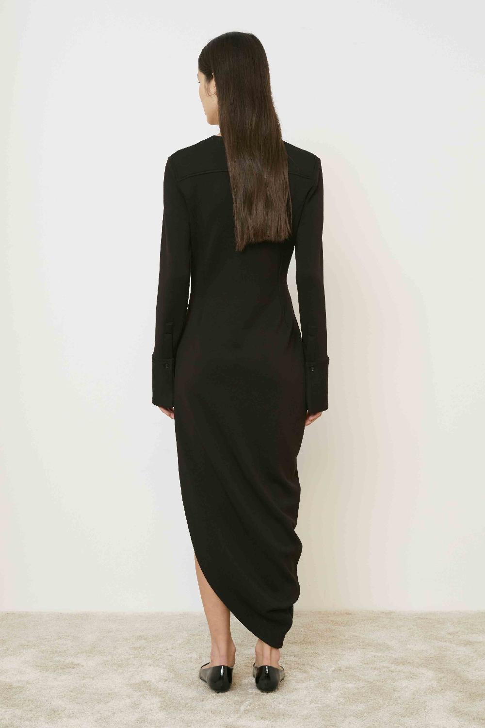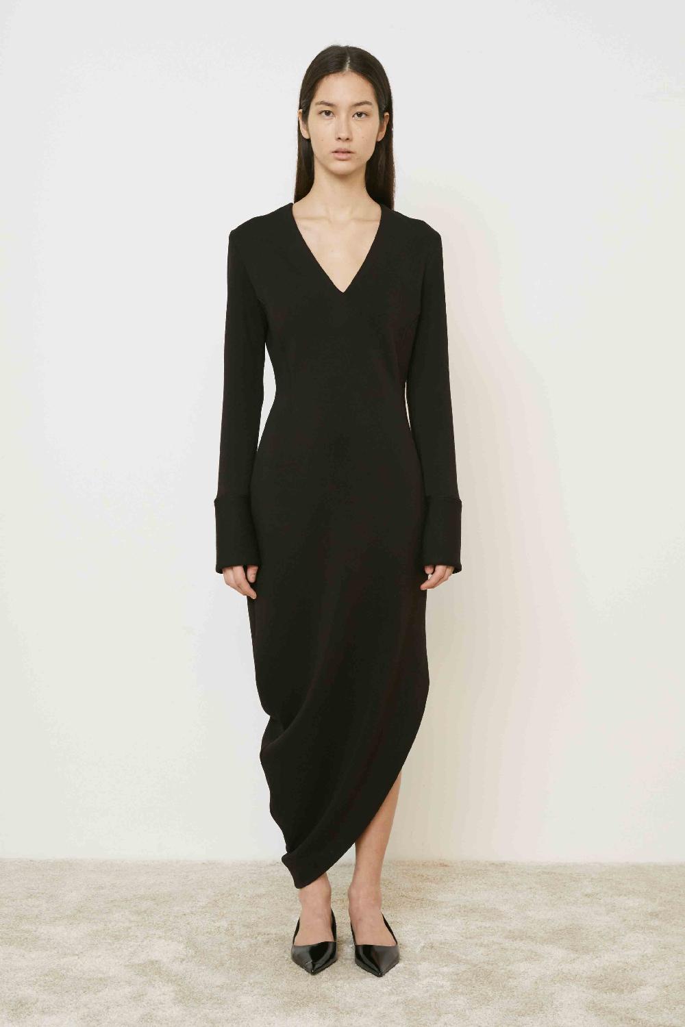 ABITO LUNGO CON SCOLLATURA A v E MANICHE LUNGHE CON POLSINI ALTI.ORLO ASIMMETRICO A PUNTA