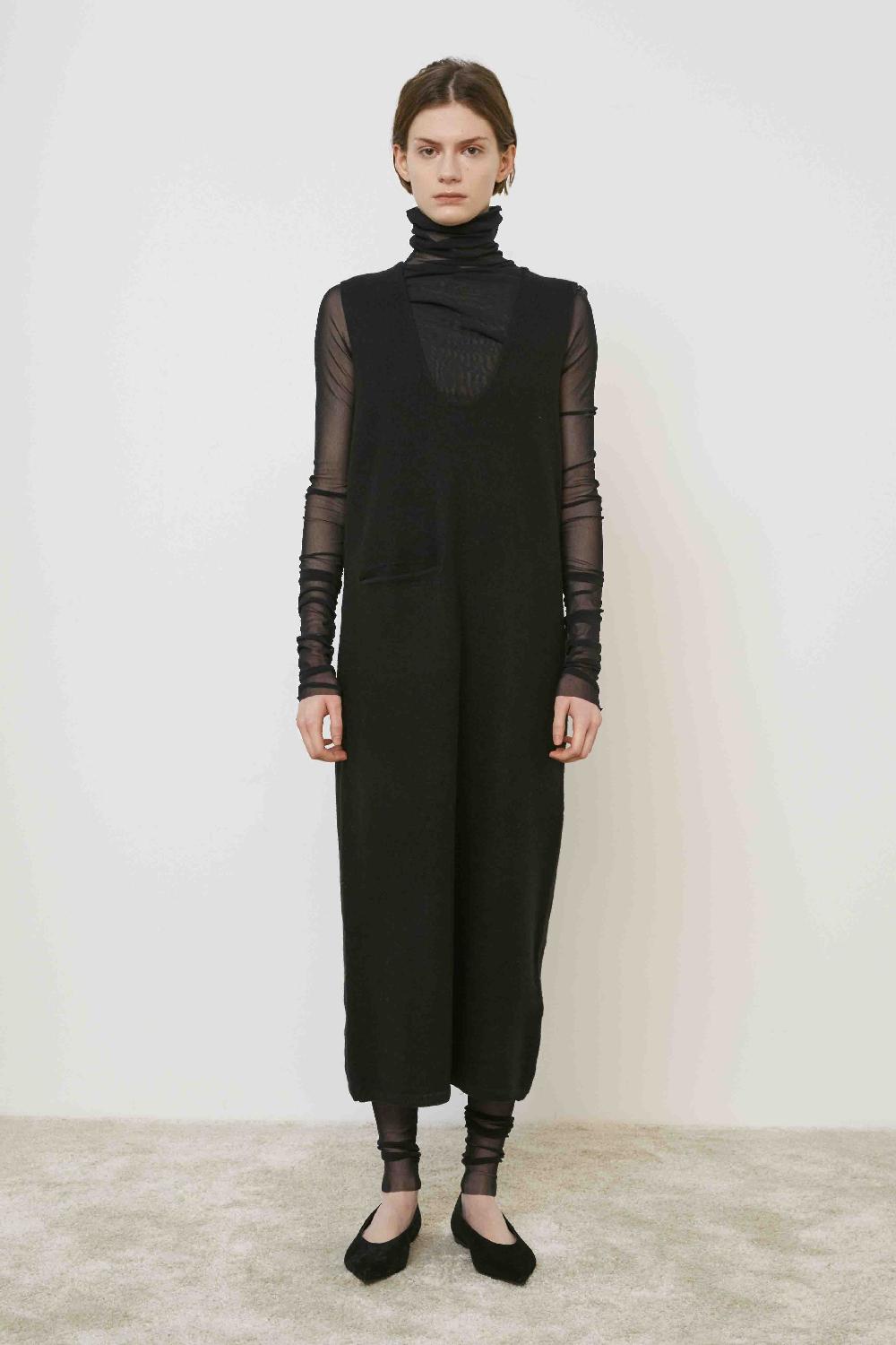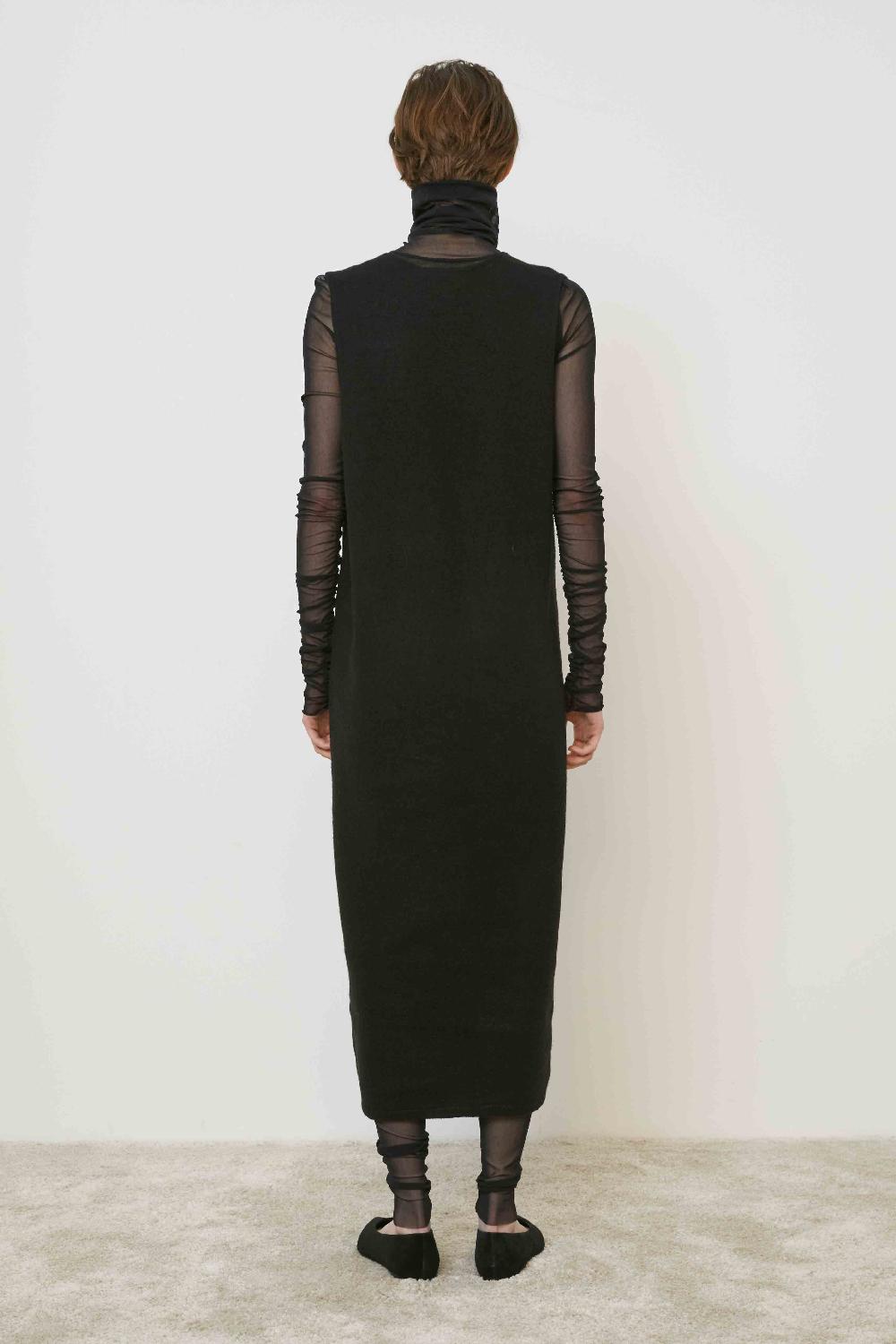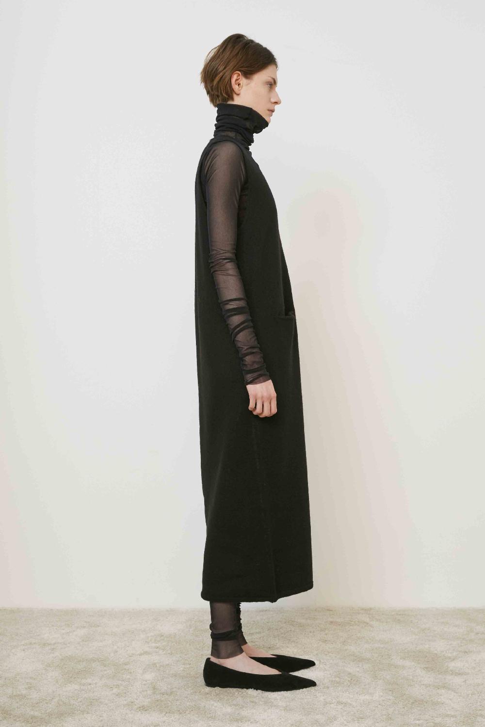 ABITO LUNGO DI LINEA DRITTA SENZA MANICHE SCOLLATO A "V" CON TASCA SUL DAVANTI.