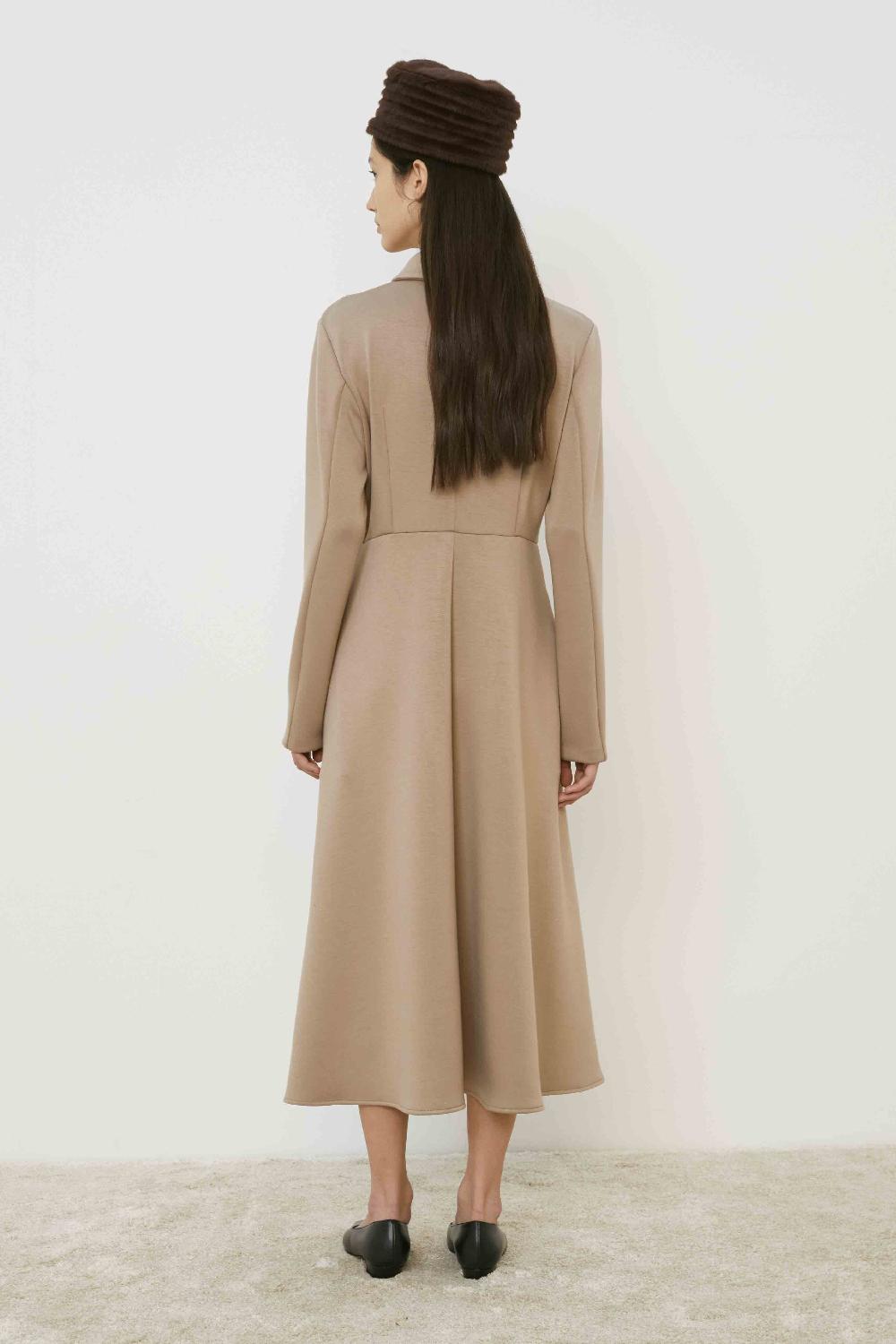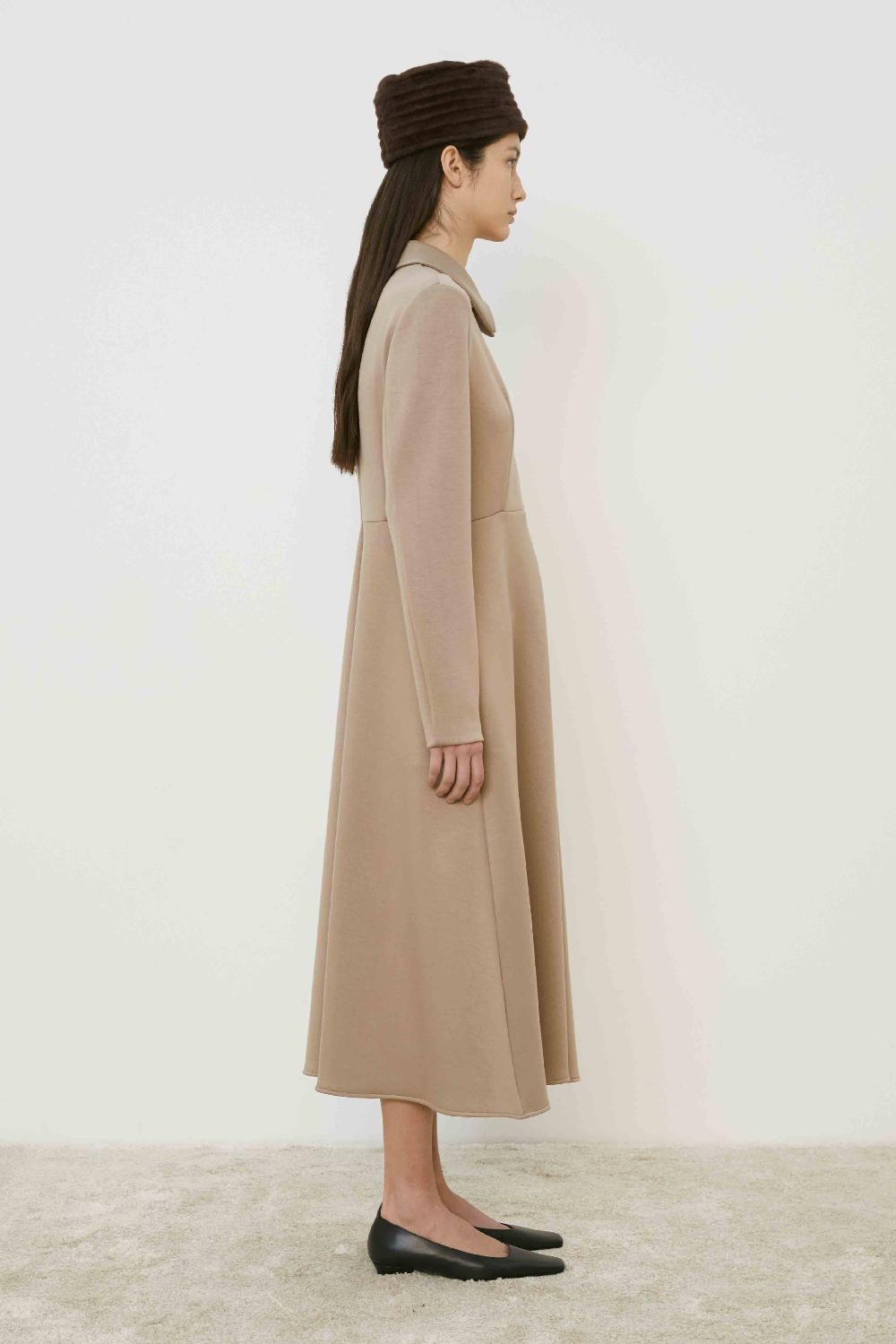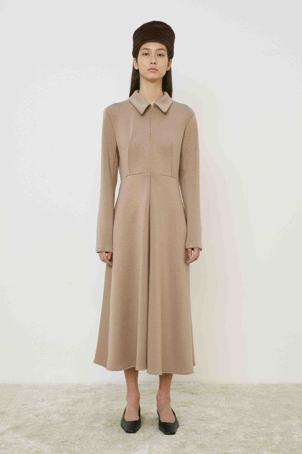 ABITO LUNGO DI LINEA SVASATA CON TASCHE LATERALI,COLLETTO TIPO CAMICIA E CHIUSURA FRONTALE CON ZIP INVISIBILE
