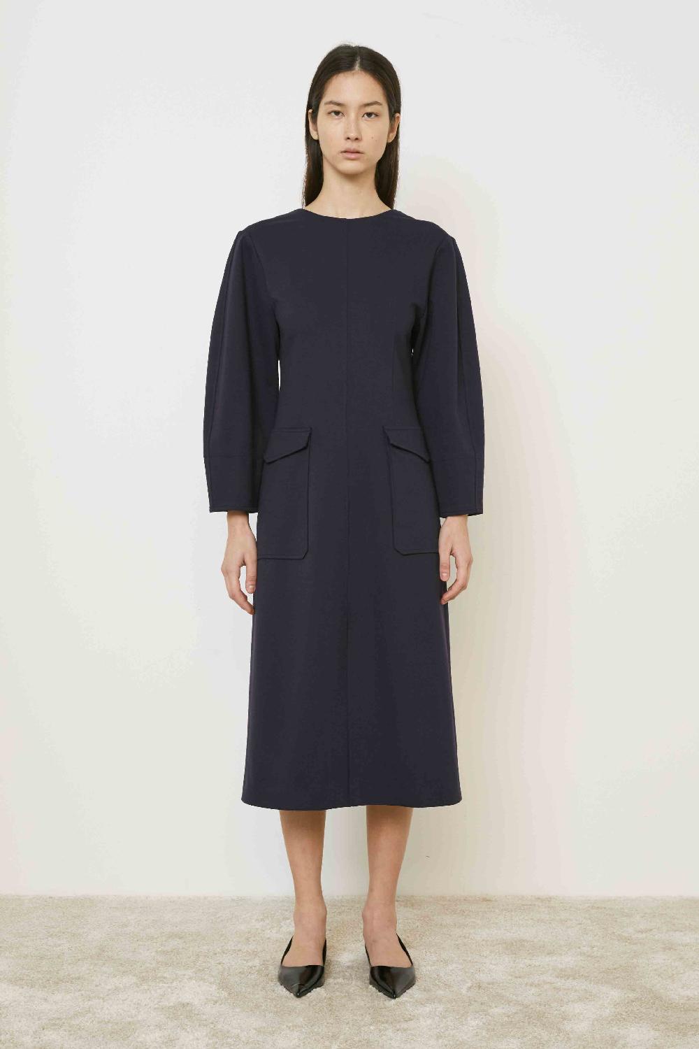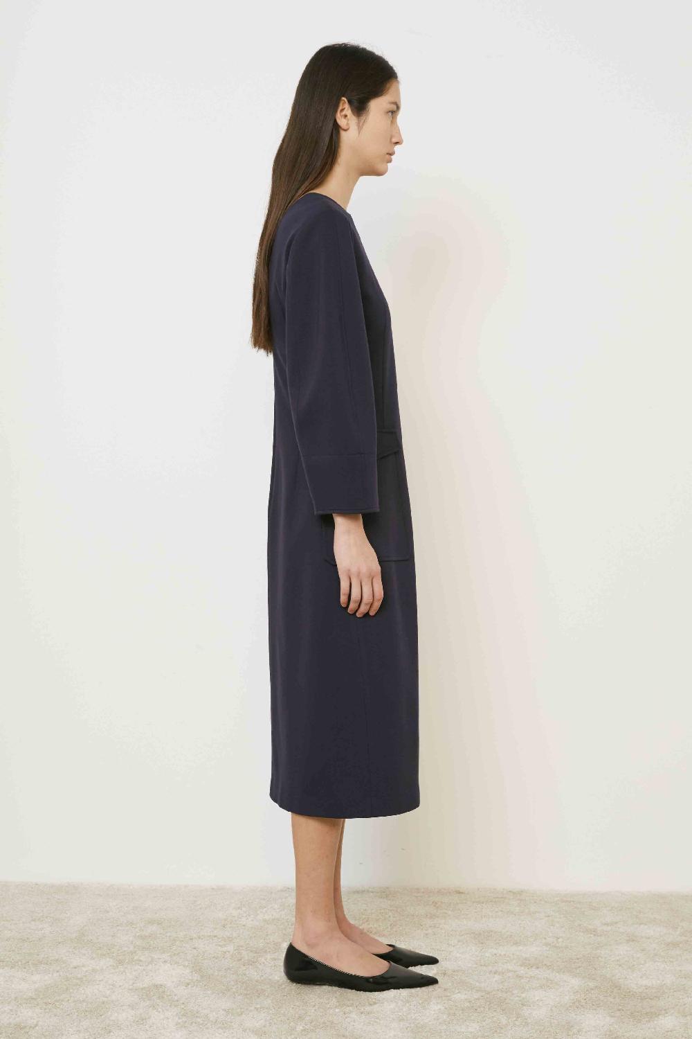 ABITO A MANICHE LUNGHE CON SCOLLO ROTONDO,TASCHE APPLICATE E SPACCO SUL DAVANTI.SCOLLATURA A "V" SUL DIETRO E CHIUSURA CON ZIP INVISIBILE.