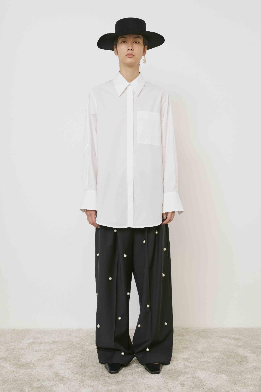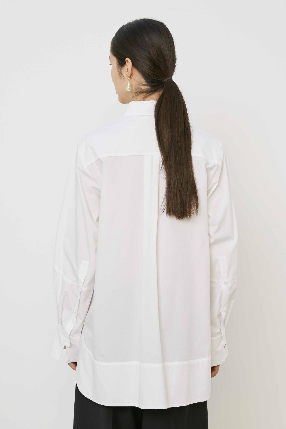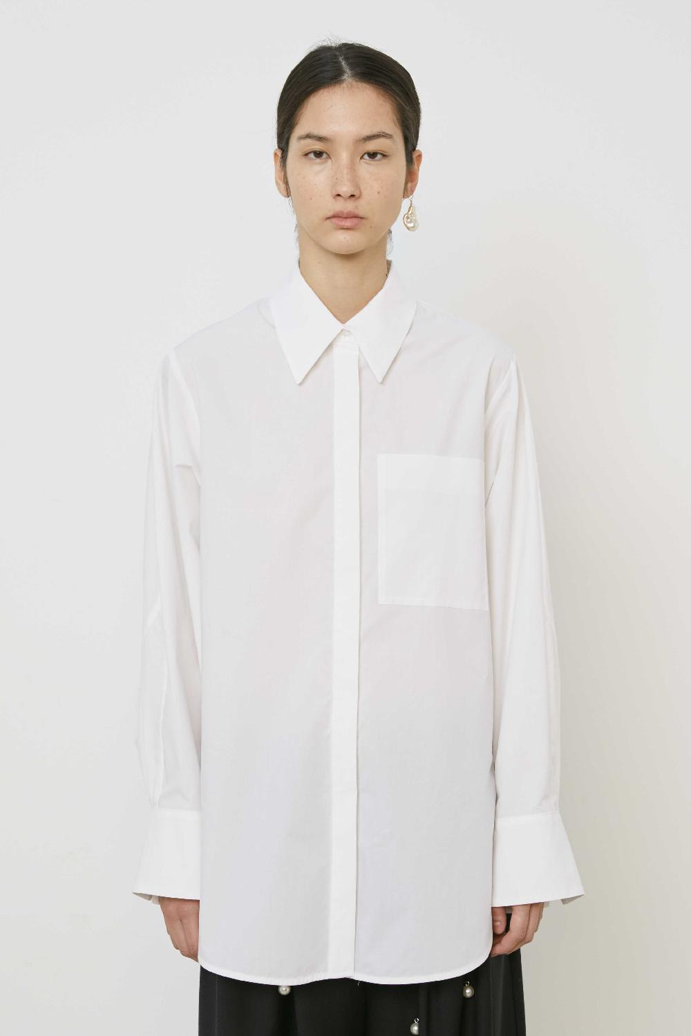 CAMICIA A MANICA LUNGA CON POLSINI ALTI,TASCA DAVANTI E ORLO ARROTONDATO.CONTROPIEGA CENTRALE SUL DIETRO.