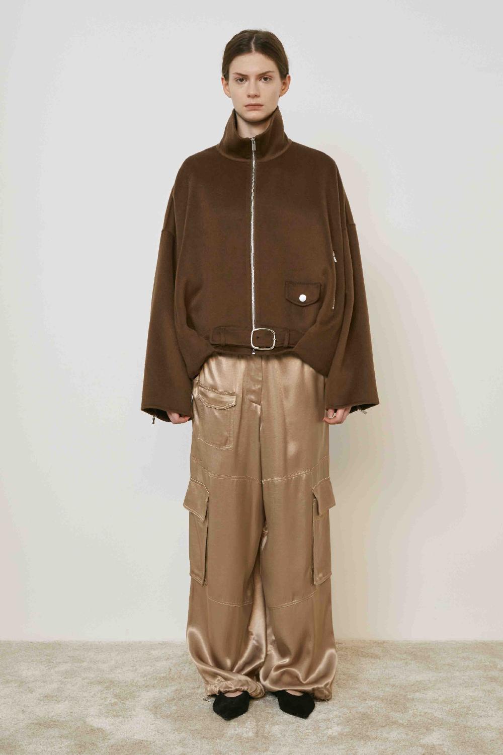 CAPPOTTO CORTO SFODERATO DI LINEA AMPIA.CHIUSURA FRONTALE CON ZIP,MANICA LARGA CON SPALLA SCESA E ZIP APPLICATE.CINTURA ABBINATA NELLO STESSO TESSUTO CON FIBBIA DI METALLO.