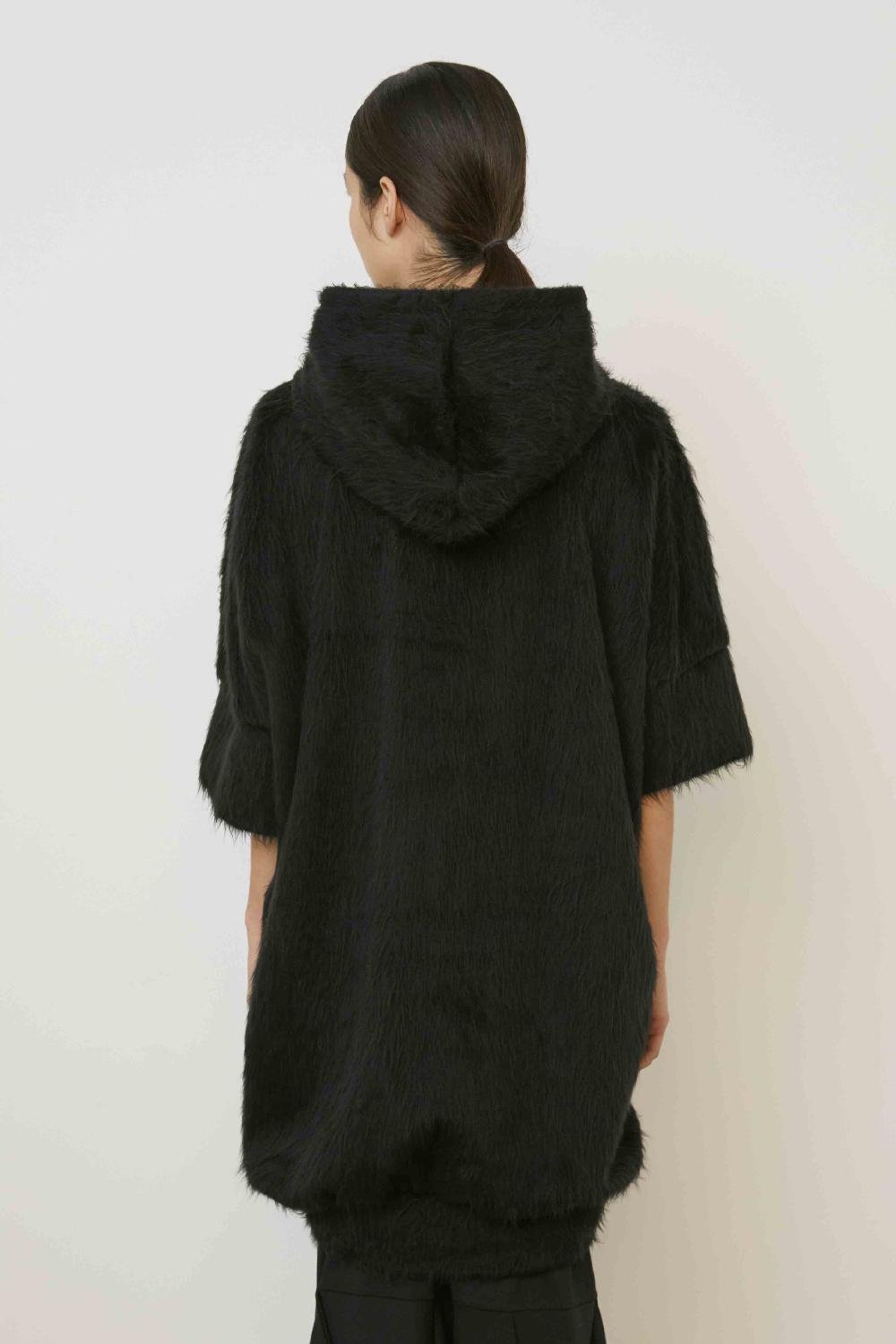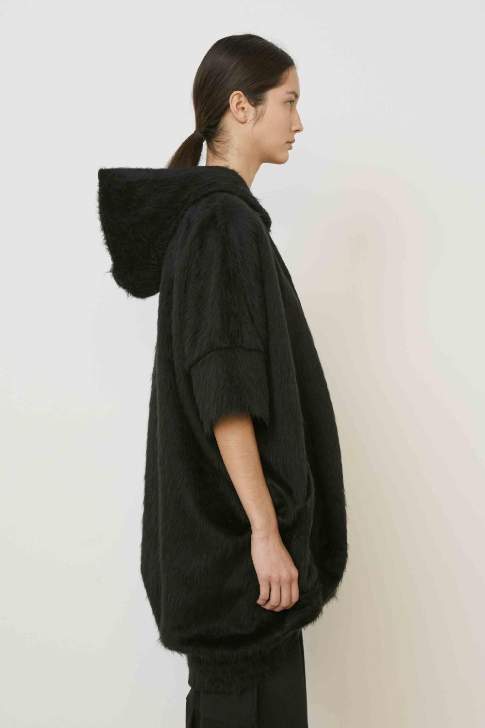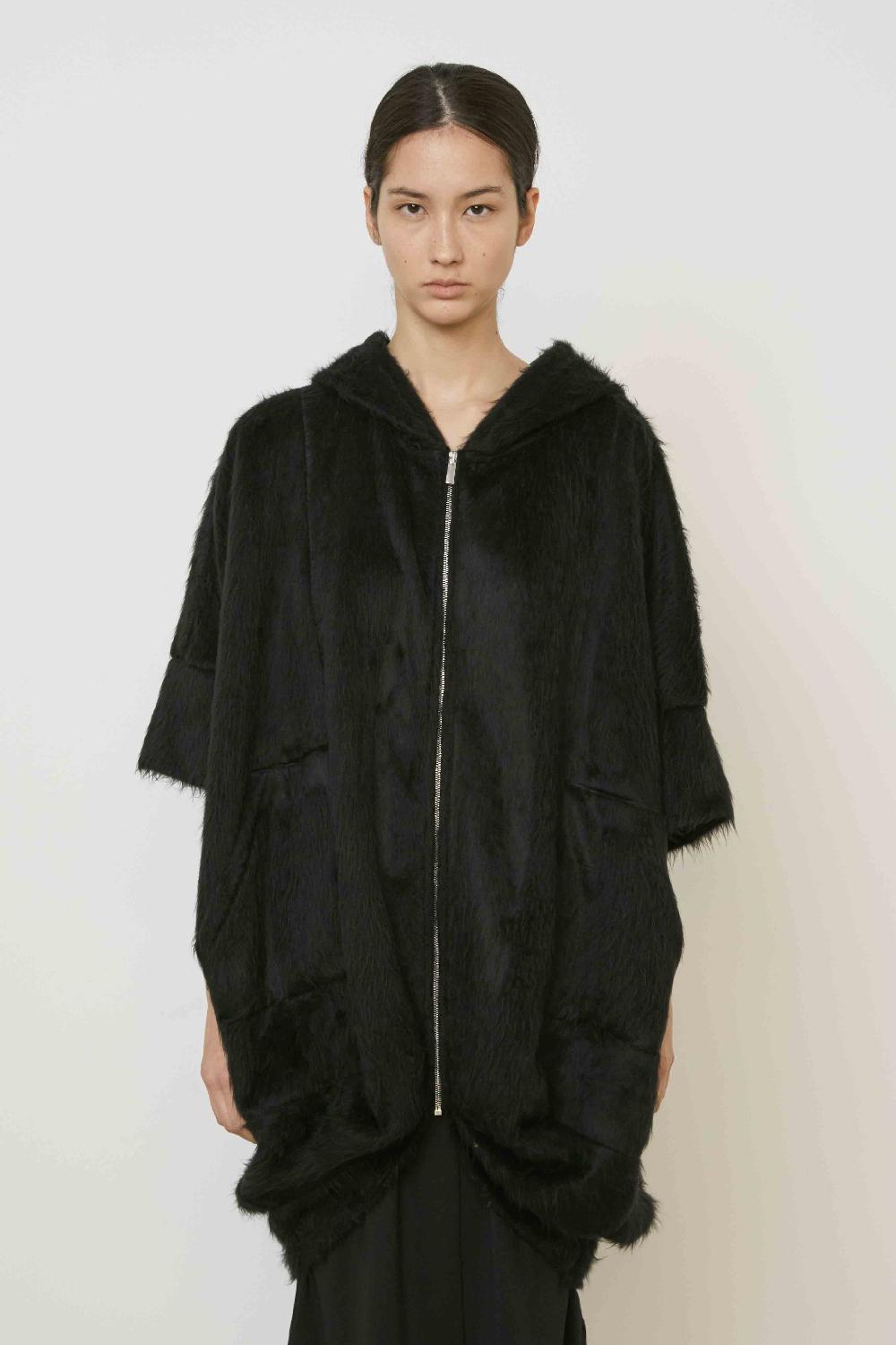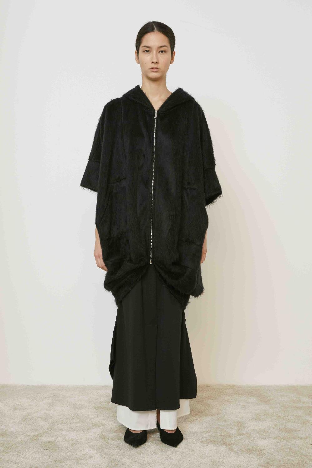 GIACCA LUNGA CON CAPPUCCIO FODERATO IN TAFFETà,TASCHE APPLICATE SUL DAVANTI E CHIUSURA FRONTALE CON ZIP DI METALLO.ORLO ASIMMETRICO.