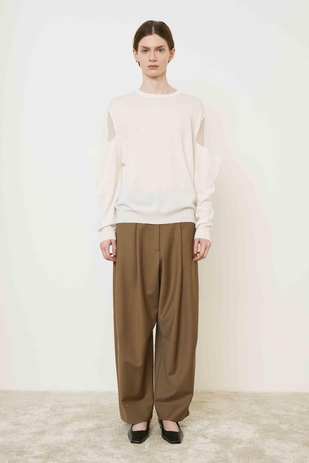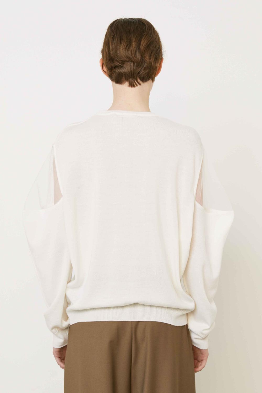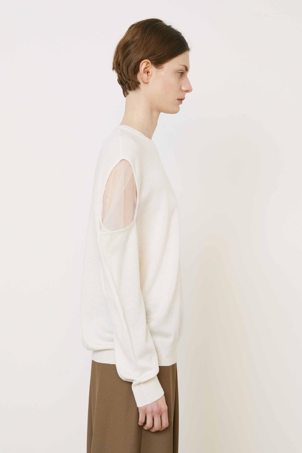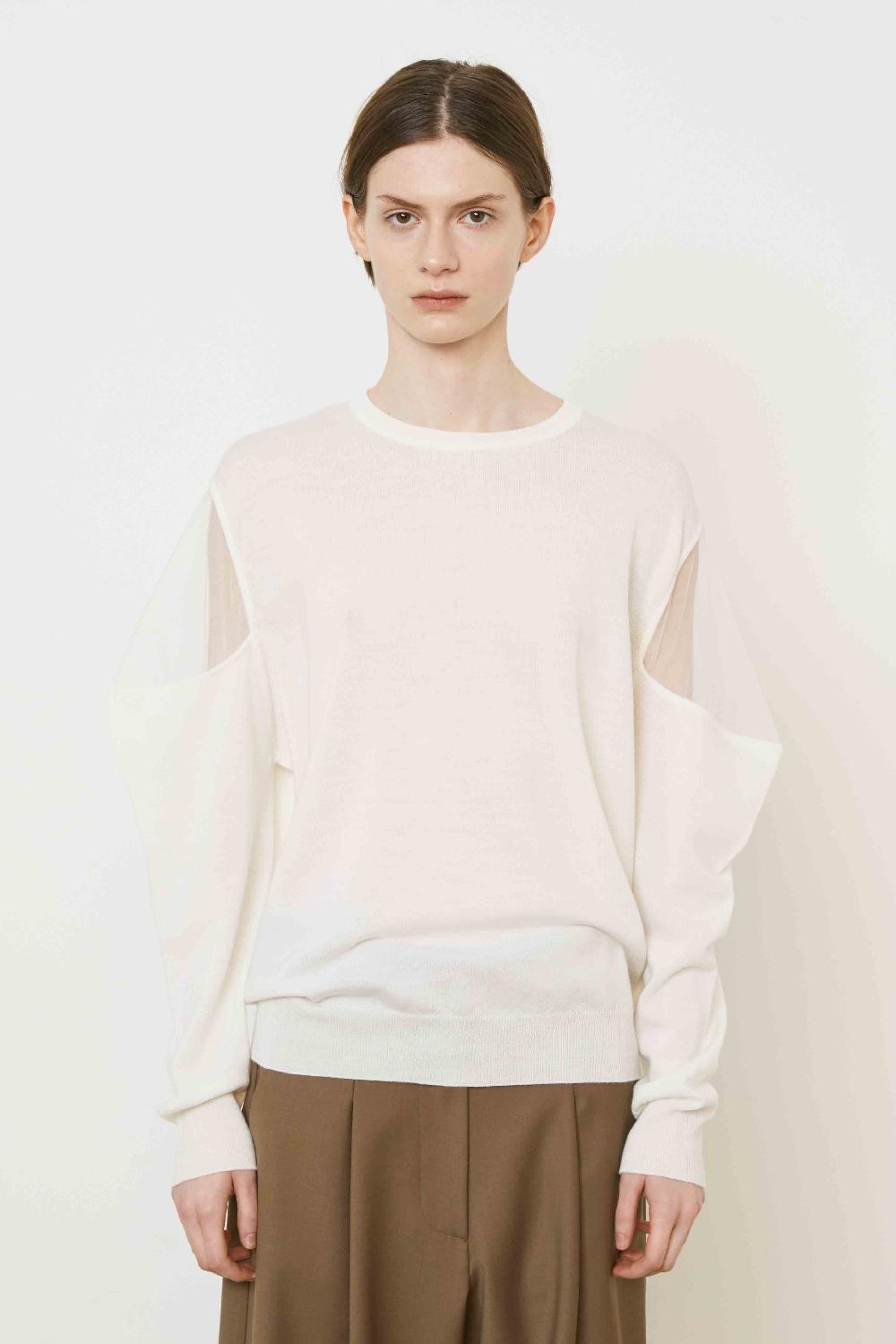 MAGLIA IN PURA LANA A MANICHE LUNGHE,SCOLLO ROTONDO ED INSERTO DI TULLE.