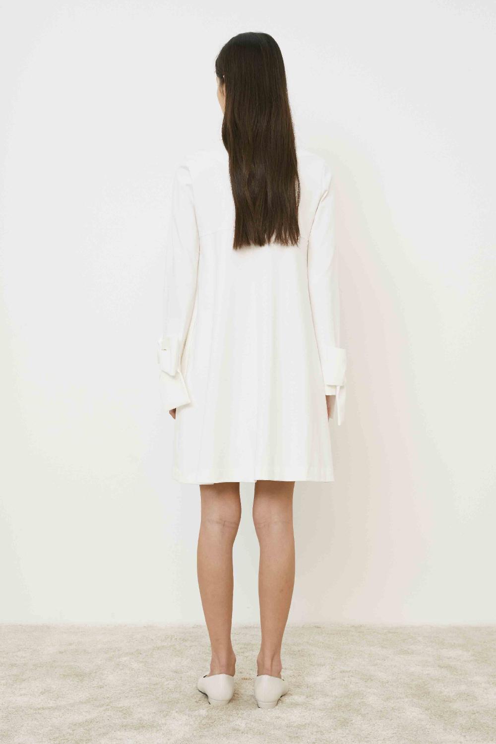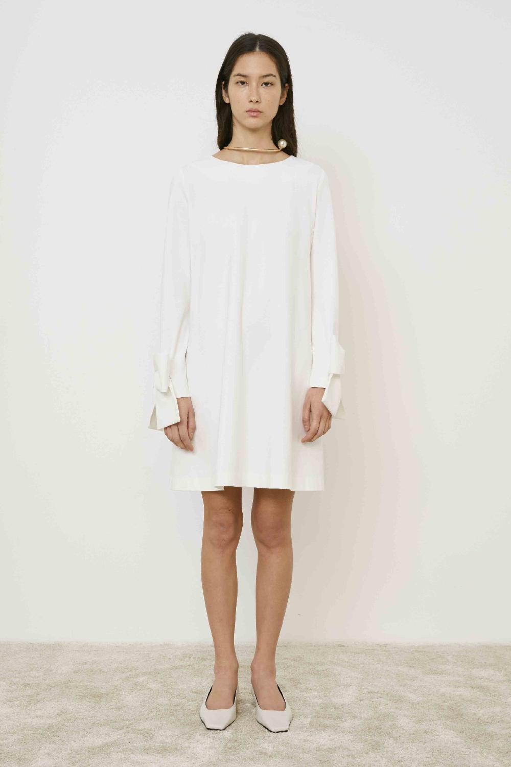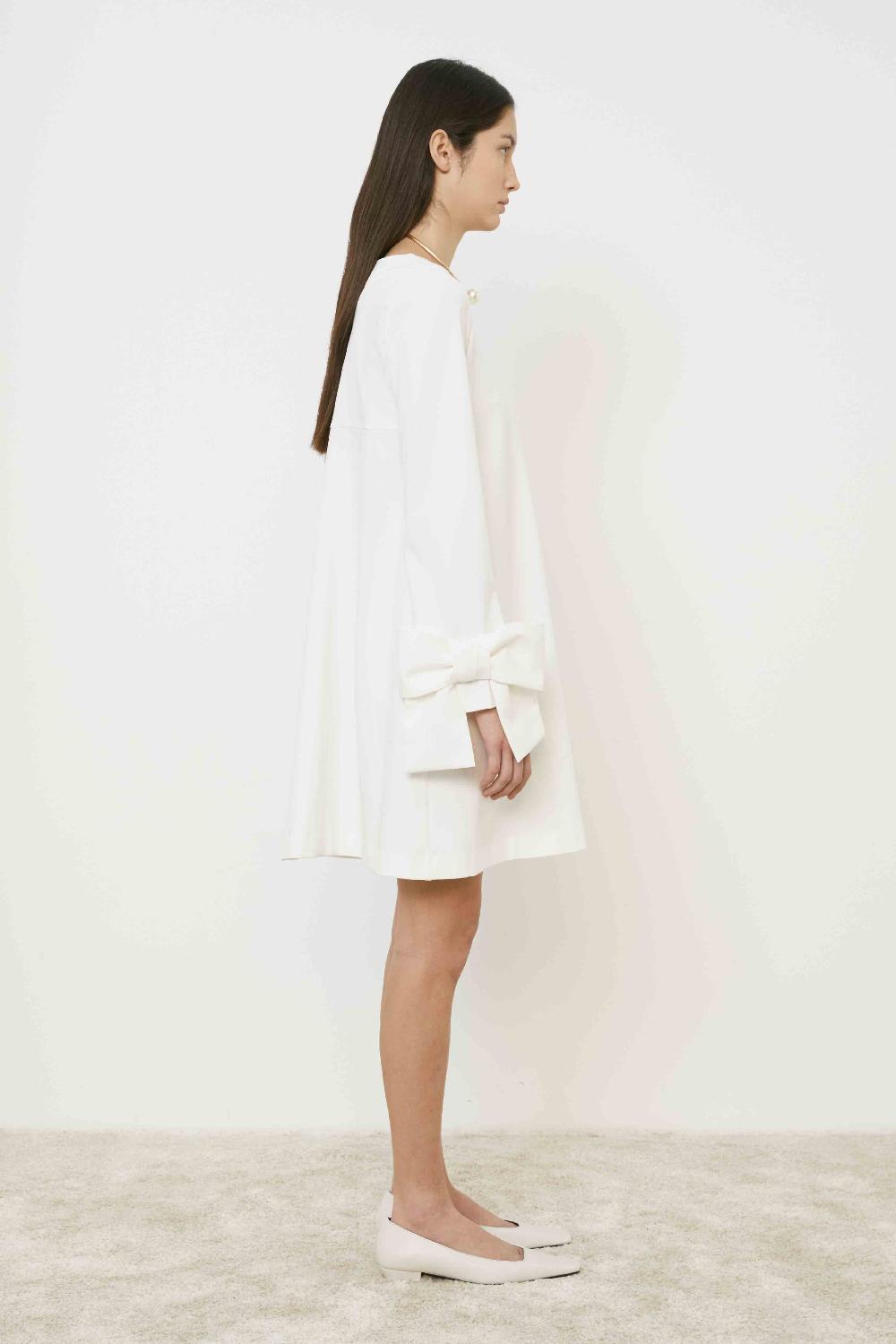 MINI-ABITO DI LINEA SVASATA CON FIOCCO APPLICATO SULLE MANICHE.
