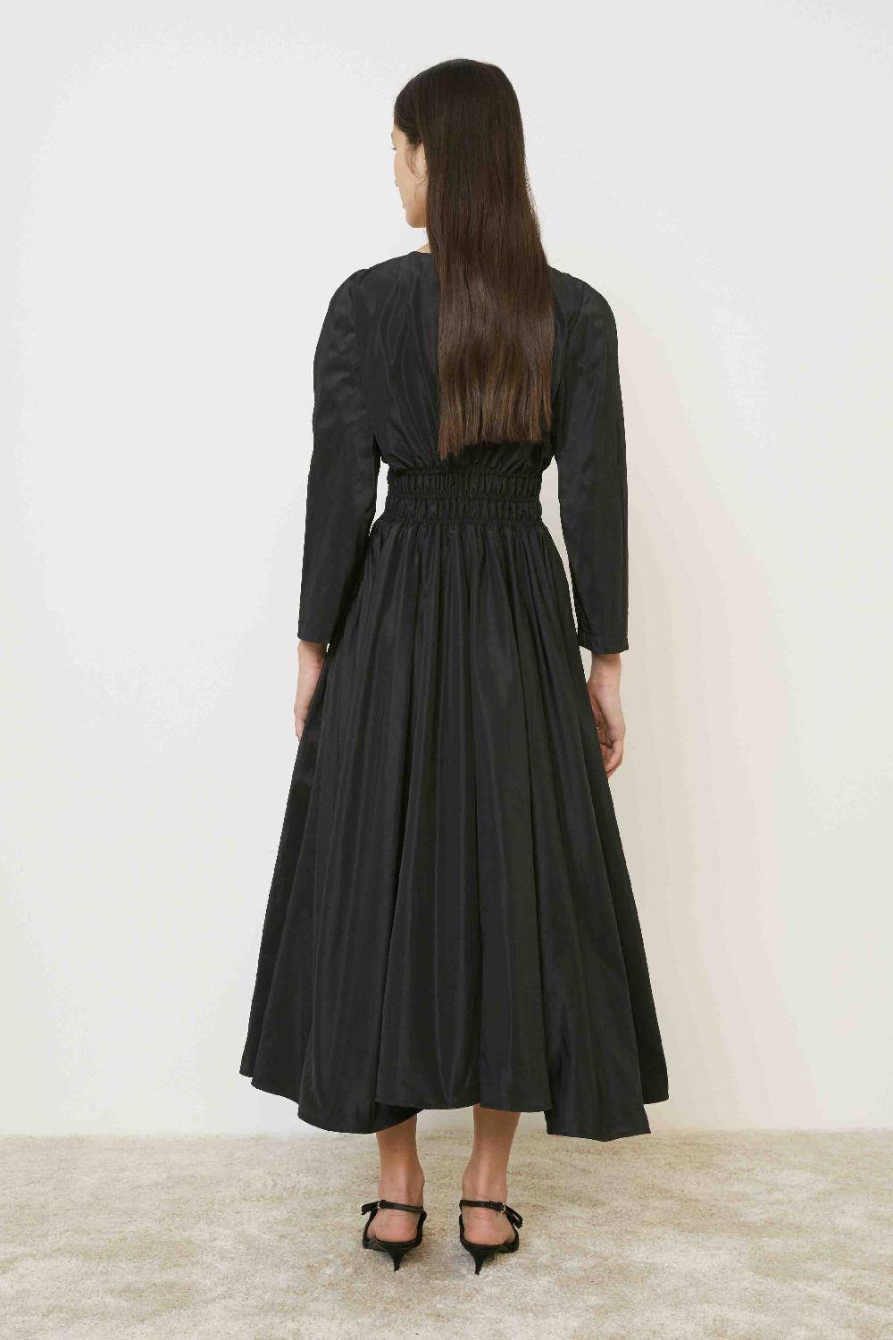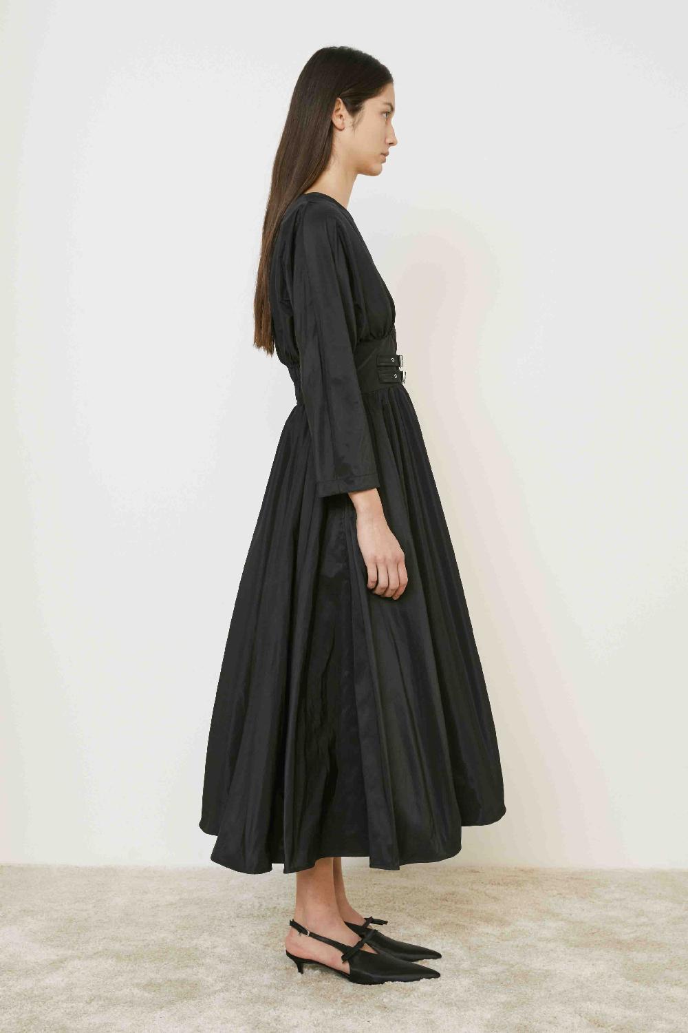 ABITO ALLA CAVIGLIA CON SCOLLO A "V",GONNA A GODET,MANICA A KIMONO E FASCIONE CON DOPPIA FIBBIA.
