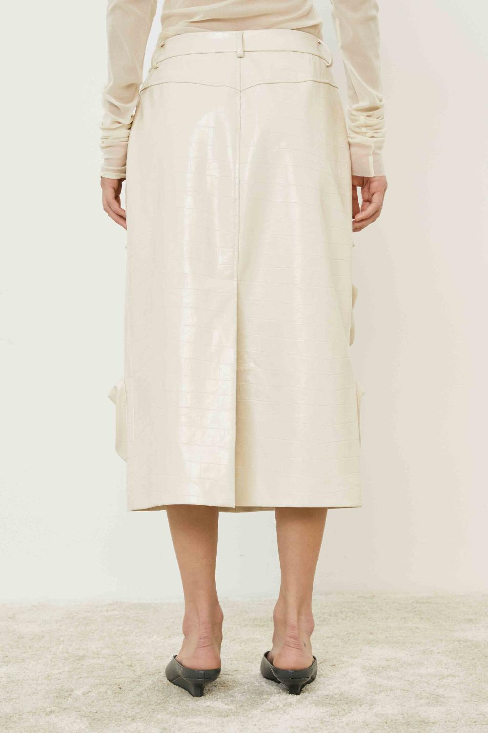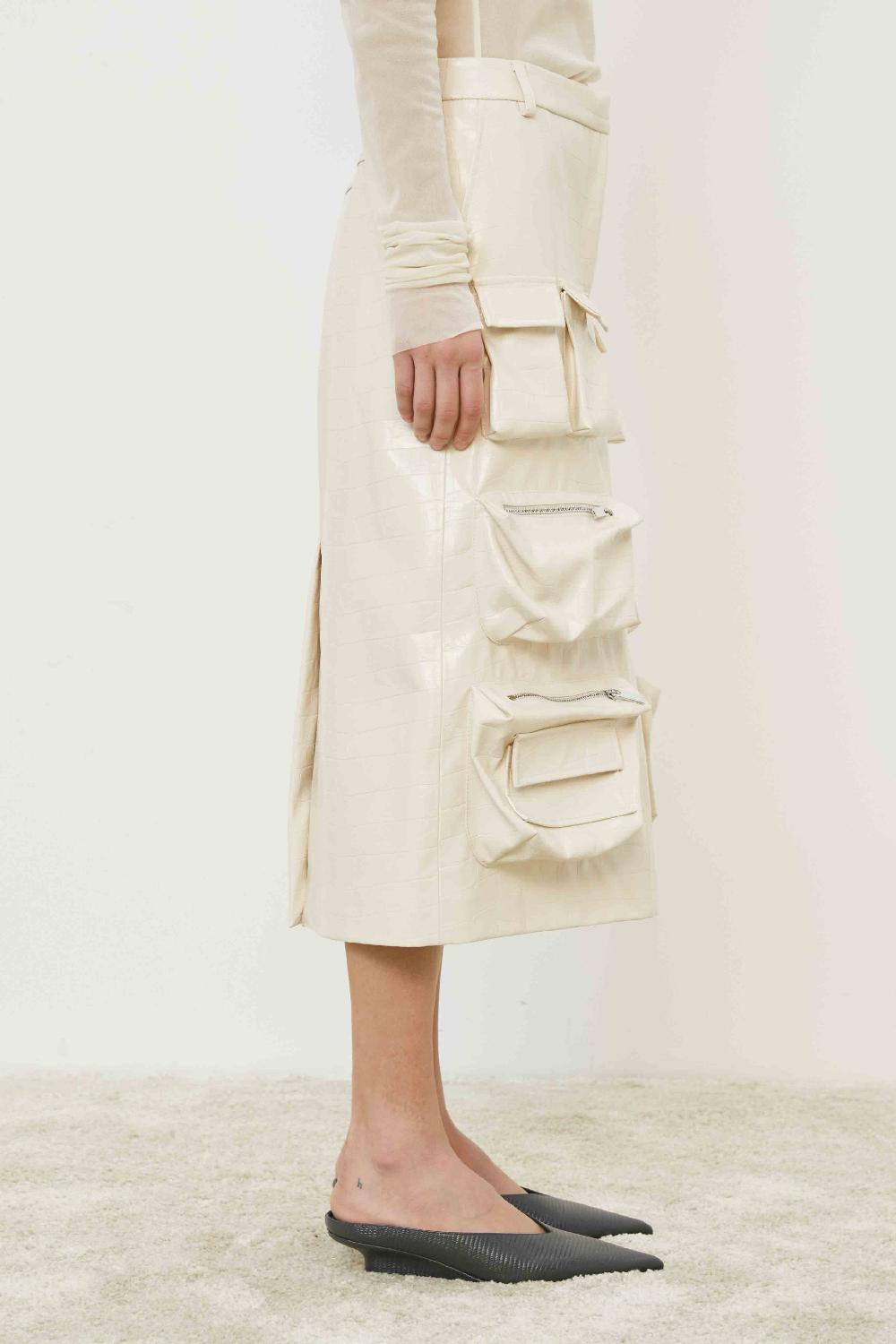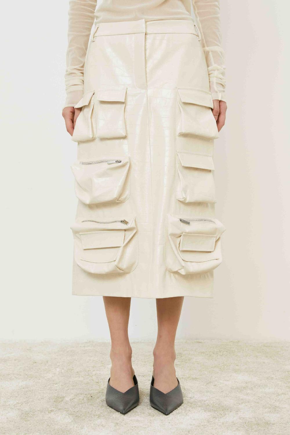 GONNA IN ECOPELLE CON TASCHE MULTIPLE CHIUSURA FRONTALE CON SPACCO POSTERIORE E ZIP